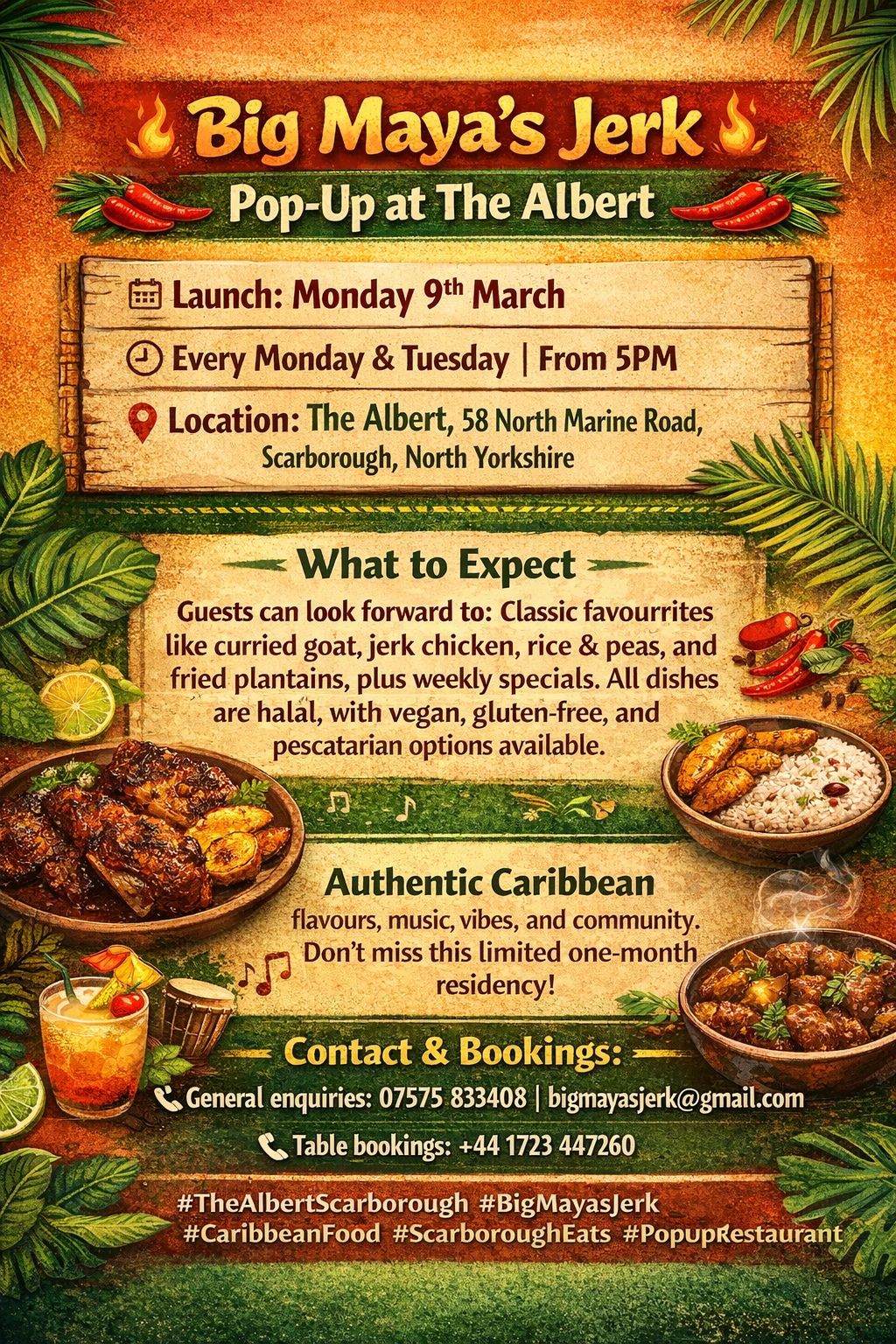 We’re bringing authentic Afro-Caribbean flavours to The Albert every Monday & Tuesday from 5PM, starting 9th March, for a month of delicious food and good vibes. Enjoy curried goat, jerk chicken, rice & peas, fried plantains, and weekly specials — all halal, with vegan, gluten-free, and pescatarian options.